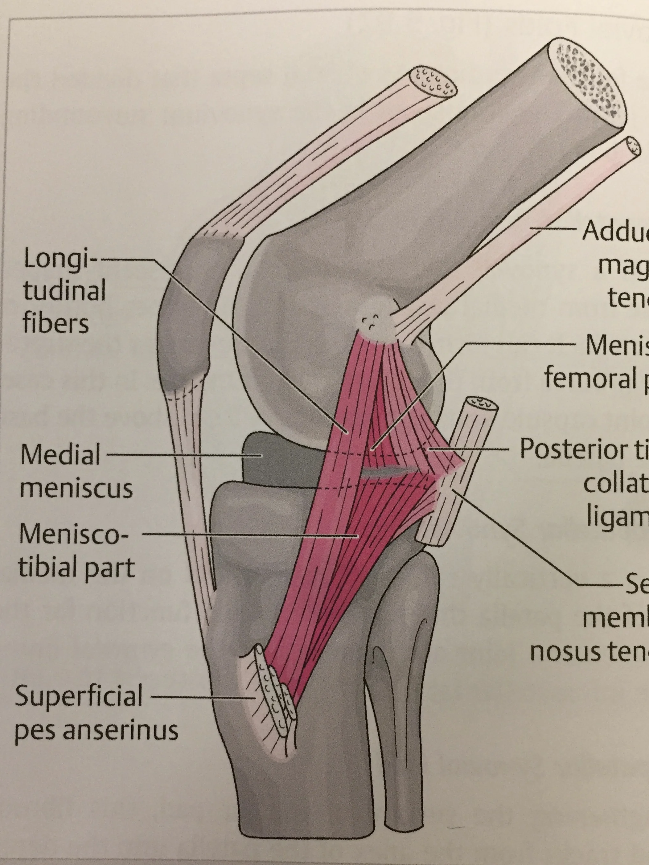 The Medial collateral ligament is an important stabilizer of the knee by providing support and resistance to prevent the knee from falling inwards or rotating in excess. It runs along the inside of the femur and tibia, it also has connections to other important knee structures which can make the injuries a little riskier. (1)